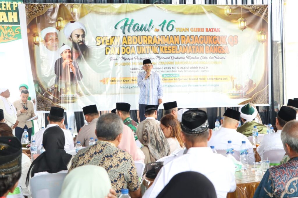 Suasana khidmat dan penuh keakraban mewarnai Pondok Persulukan Serambi Babussalam di Nagori Jawa Tongah, Kecamatan Hatonduhan, Kabupaten Simalungun, Sumatera Utara saat Bupati Simalungun, Dr H Anton Achmad Saragih, menghadiri Haul ke-16 Tuan Guru Batak Syekh Abdurrahman Rajagukguk QS, Sabtu (27/9/2025).